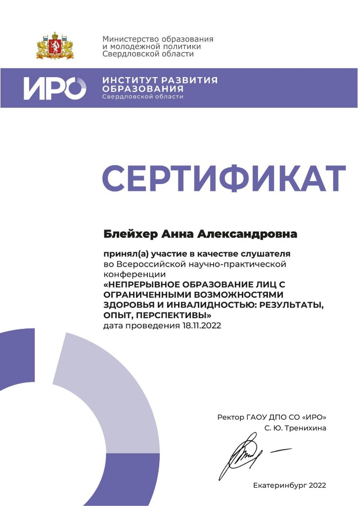 «Непрерывное образование лиц с ограниченными возможностями здоровья и инвалидностью: результаты, опыт, перспективы.», Всероссийская научно-практическая конференция, ИРО Свердловской области, 2022г. |